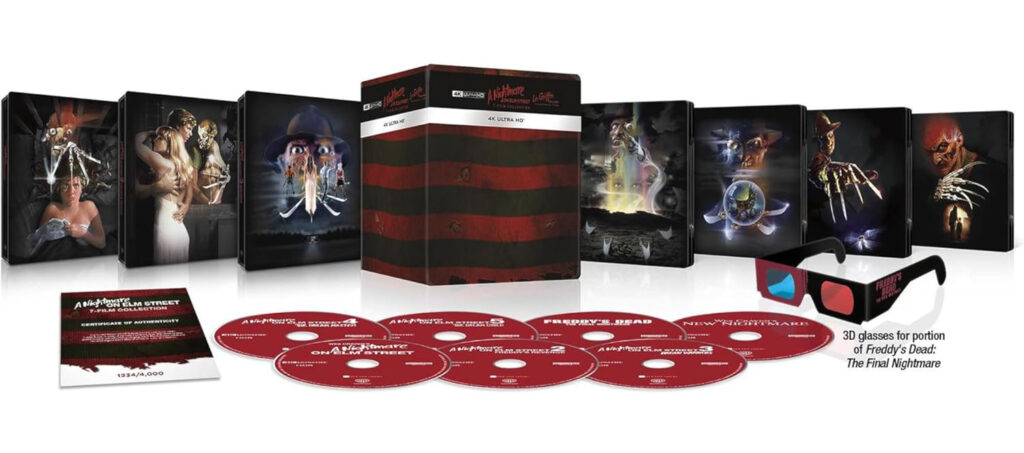 From New Line Cinema, the collection includes the original seven films – A Nightmare on Elm Street (1984), A Nightmare on Elm Street 2: Freddy’s Revenge (1985), A Nightmare on Elm Street 3: Dream Warriors (1987), A Nightmare on Elm Street 4: The Dream Master (1988), A Nightmare on Elm Street 5: The Dream Child (1989), Freddy’s Dead: The Final Nightmare (1991), and Wes Craven’s New Nightmare (1994) – along with the uncut versions of A Nightmare on Elm Street and The Dream Child. The collection also includes an alternate ending of Freddy’s Dead: The Final Nightmare presented in anaglyph 3D and complete with 3D glasses in the physical collection.