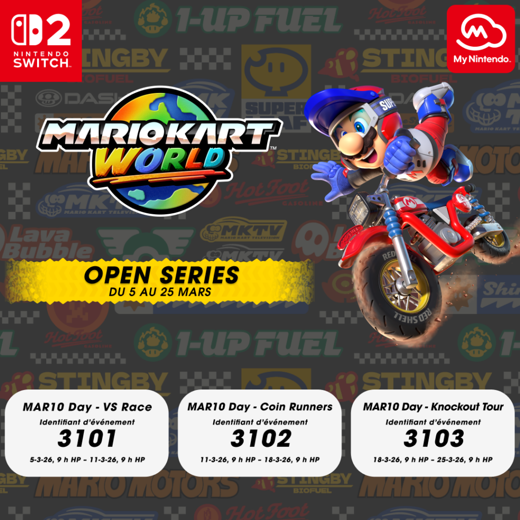 Rejoignez l’événement My Nintendo Open Series pour Mario Kart World – Ce mois-ci, les membres Nintendo Switch Online peuvent participer à une série hebdomadaire de courses en ligne dans Mario Kart World. Rejoignez l’un des trois événements du jeu et remportez 310 points platine My Nintendo⁴ simplement en participant (accessible à tous les participants des Amériques). Vous n’êtes pas encore membre? Profitez d’un essai gratuit de 7 jours à Nintendo Switch Online, même si vous avez déjà bénéficié de cette offre (l’essai gratuit est limité à une seule utilisation par compte après le 12 janvier 2026). Pour plus d’informations, rendez-vous sur My.Nintendo.com.