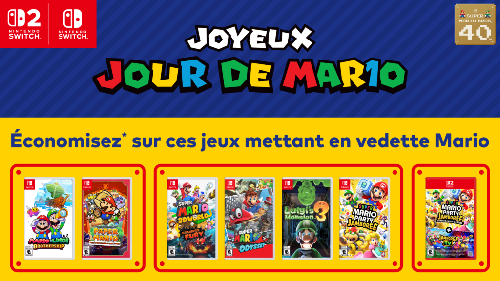 VANCOUVER, B.C., 10 mars 2026 – Joyeux jour de MAR10 à tout le monde! Nintendo et Illumination ont récemment surpris les fans de Mario avec une toute nouvelle bande-annonce de Super Mario Galaxy Le Film, en salles partout au pays dès le 1er avril. À partir d’aujourd’hui, les fans peuvent ouvrir l’application gratuite pour appareils intelligents Nintendo Today!¹ chaque jour pour débloquer une carte à collectionner numérique inspirée du film. À partir du 1er avril, l’application permettra de s’enregistrer dans les cinémas participants et de débloquer du contenu exclusif, comme un cadre photo numérique. Il existe également de nouvelles bandes-annonces pour des jeux Nintendo Switch 2 mettant en scène Mario et ses amis, dont Super Mario Bros. Wonder – Nintendo Switch 2 Edition + Meetup in Bellabel Park et Yoshi and the Mysterious Book. De plus, Nintendo célèbre les 40 ans du jeu Super Mario Bros. avec des offres spéciales sur des jeux, et bien plus encore.