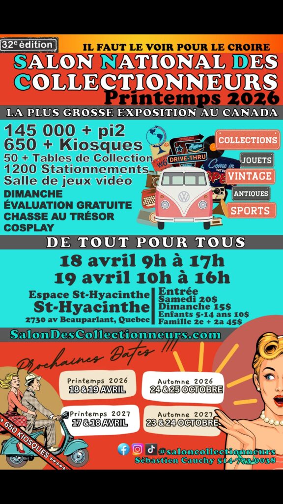Préparez-vous à plonger dans un univers de nostalgie et de découvertes : le Salon National Des Collectionneurs est de retour à l’Espace St-Hyacinthe les 18 et 19 avril prochains. Déjà sacré plus grand salon multi-collection intérieur au Canada, l’événement bat de nouveaux records cette année avec une expansion majeure.